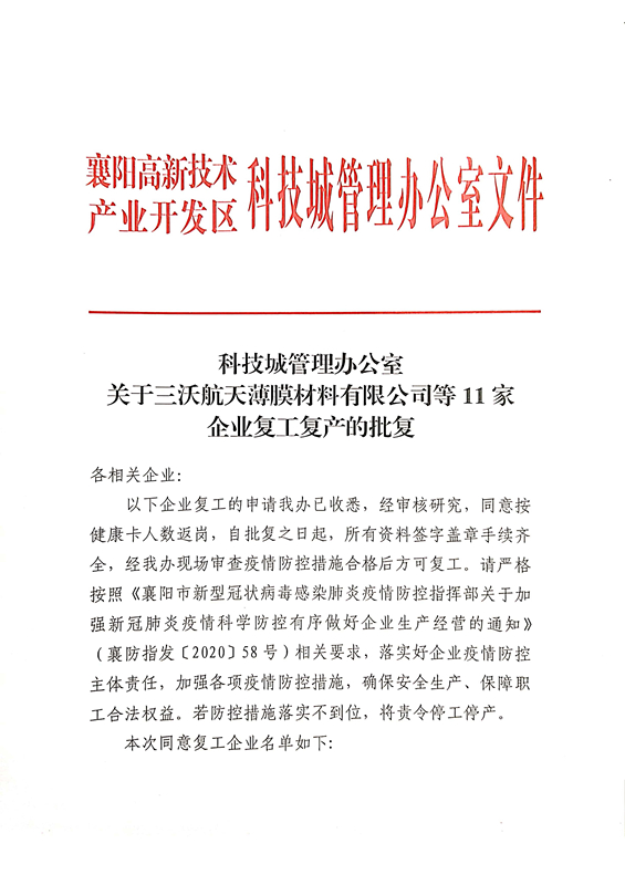 3月20,湖北展高機(jī)械裝備有限公司被高新區(qū)正式批復(fù)復(fù)工復(fù)產(chǎn)!